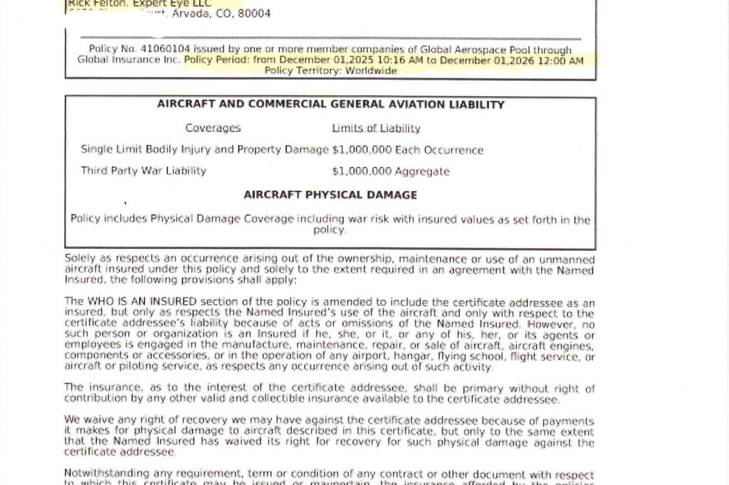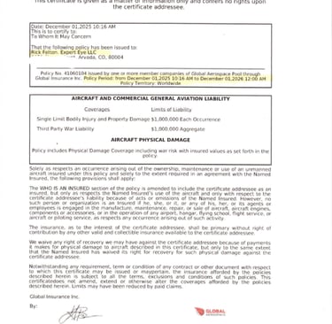 We follow all laws and FAA regulations for each mission. Local authorities are advised of drone flight times and locations. $1,000,000 in liability insurance.